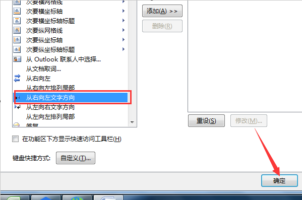 5、在进入自定义设置界面后选择所有命令下方的从右到左文字方向,并点击页面右下角的确定选项保存设置。
