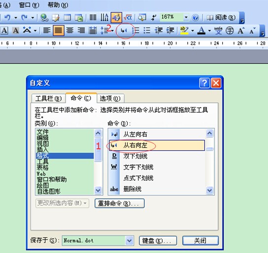 Word版本:菜单栏最右侧空白处——右键——自定义——命令——类别:格式——对应命令:从右到左——直接“拉”到页面的格式栏——关闭《自定义》对话框。