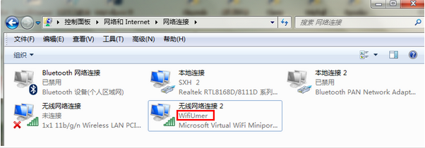 创建成功后,控制面板->网络和Internet连接->网络连接中已经创建了无线网络连接2,如下图: