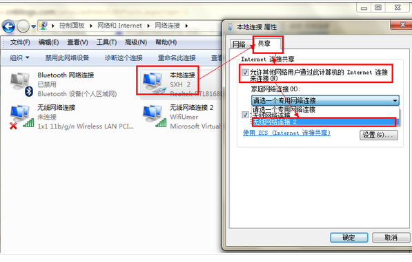 在能上网的网络连接上(如有线的本地连接,无线的无线网络连接)右击,选择属性->共享,给虚拟WiFi启用共享。