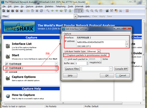 选择刚才建立的虚拟Wifi连接“无线网络连接 2”。双击后可以进行设置,去掉无线网络连接的 2 的混杂模式(Capture packets in promiscuous mode),可以减少不必要的网络包分析。如图示: