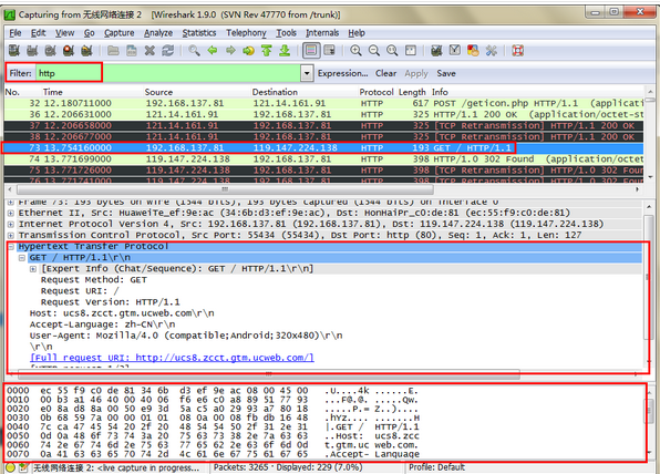 设置完成后,点击启动界面的Start,进入主界面,设置好过滤条件,只抓http协议的包,抓包数据如下:手机打开uc浏览器后,进行的联网活动。