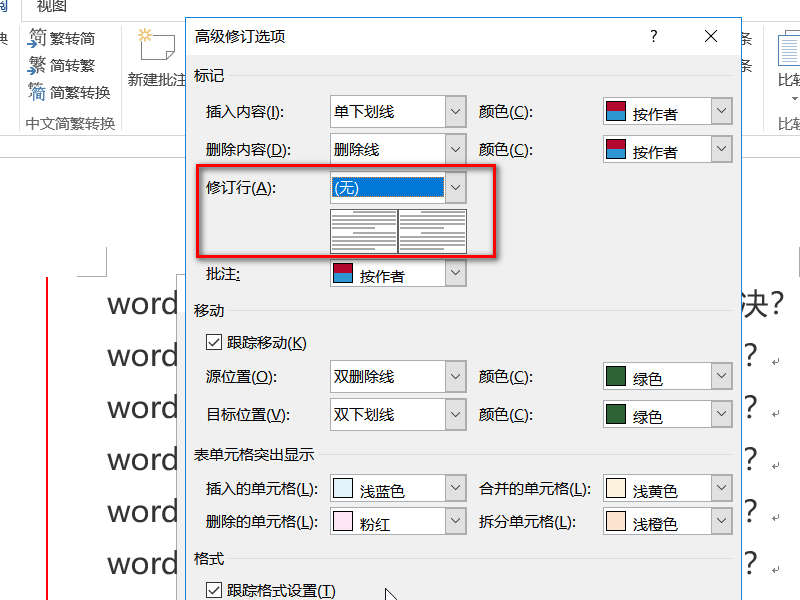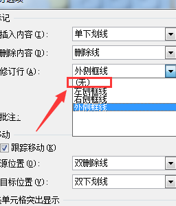 5、在弹出的“修订选项”框中找到“修订行”并选择“(无)”;