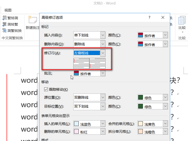 5、在高级修订选项中找到修订行设置,可以看到此时的修订行设置选项是左侧框线设置,所以我们的文本左边才会出现竖线。