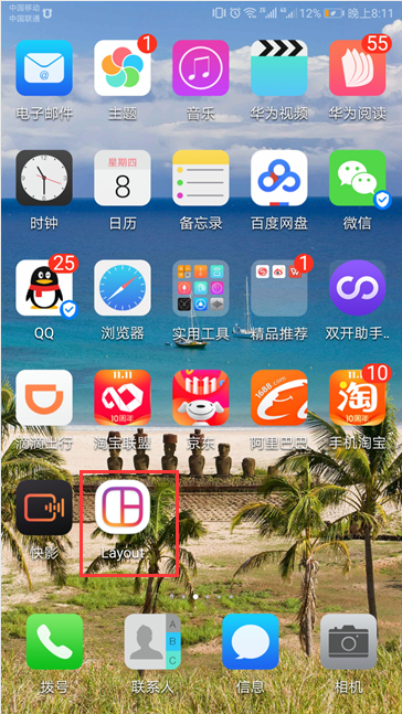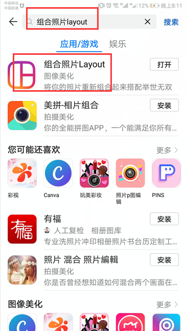 2、打开的“应用市场”中,在搜索栏中输入“组合照片Layout”进行搜索,搜完后进行下载并且安装