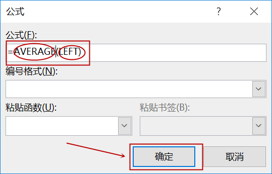 6、在等号后面输入“AVERAGE(LEFT)”/“AVERAGE(ABOVE)”。点击“确定”按钮,如下图所示。