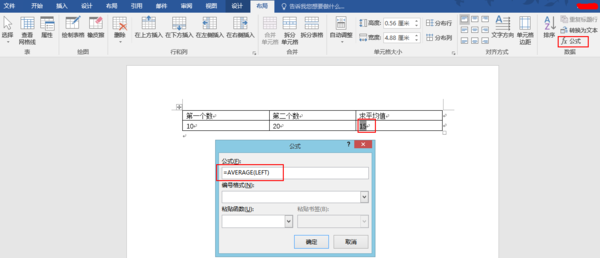启动word软件,插入表格,输入示例数据源,光标最后一个单元格,找到布局选项卡,点击fx公式,弹出公式对话框,输入=AVERAGE(LEFT),点击确定,得到平均值结果;