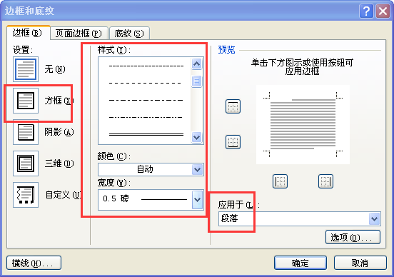 在“边框和底纹”对话框的“样式”列表中选择我们需要的边框样式。