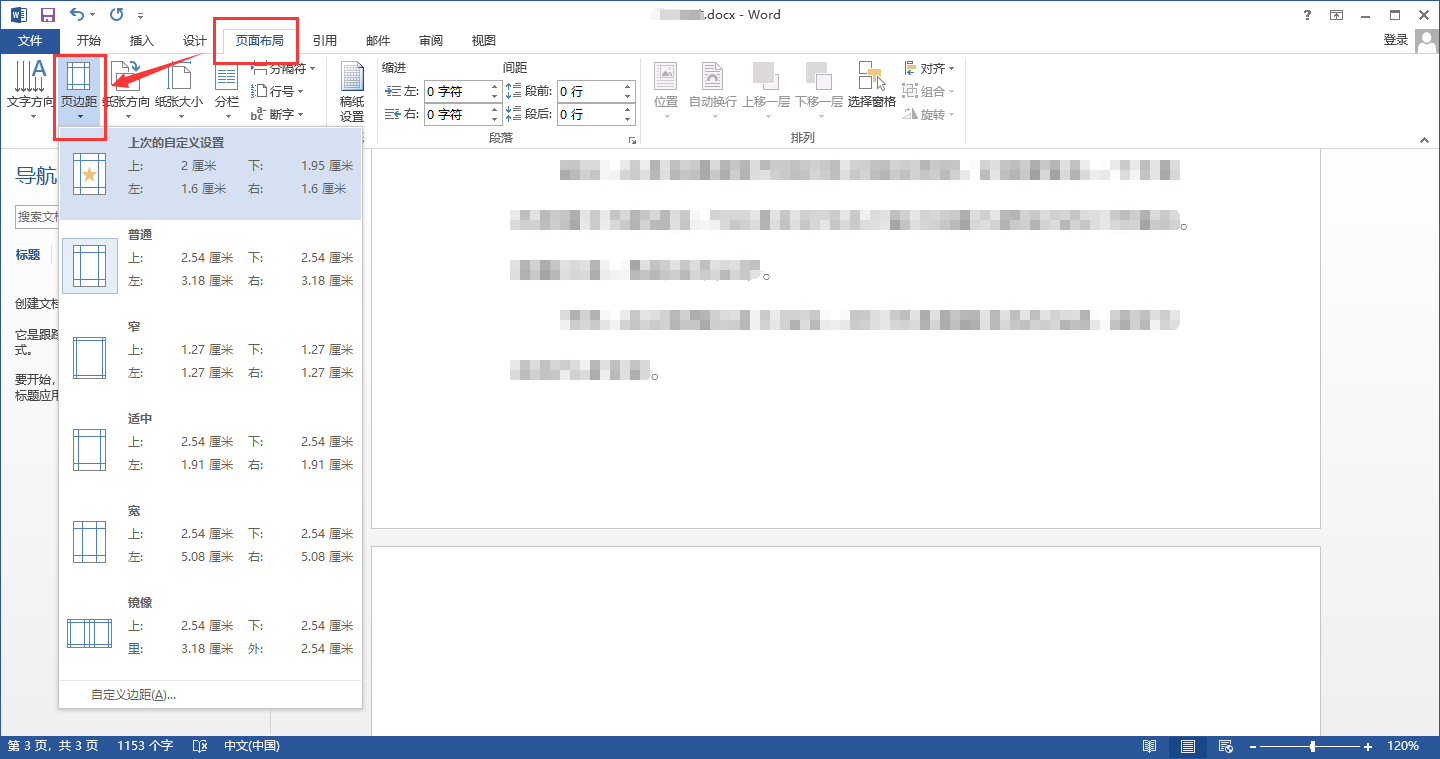 2、选择默认的页边距或是自定义修改页边距,通过调整页边距大小也可以删除空白页。