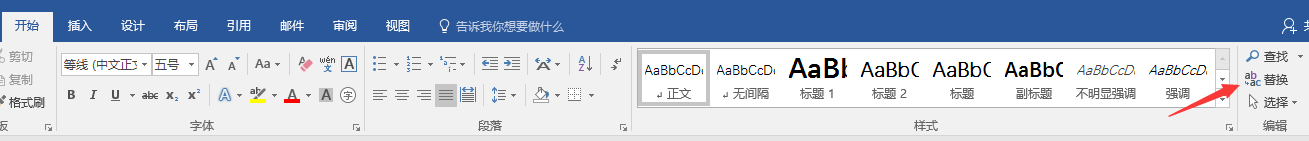 2、在word工具栏“开始”下点击“替换”。