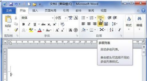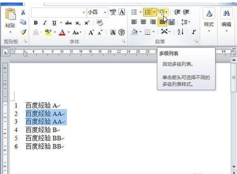 打开Word2010文档页面,在“段落”中单击“多级列表”按钮。
