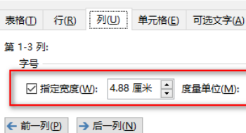 6、如果你创建表格时没有选择固定列宽,此时,你也可以在“列”选项卡下属于指定的宽度。