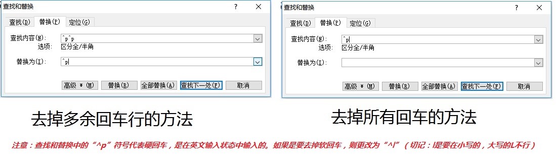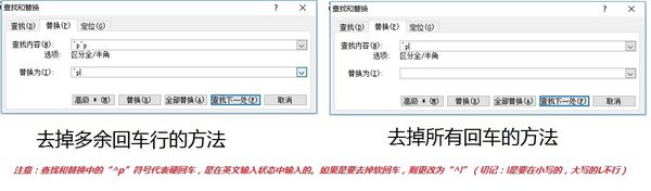 如果去掉所有回车,则查找一栏输入”^p“或”^l“,替换一栏不输入。
