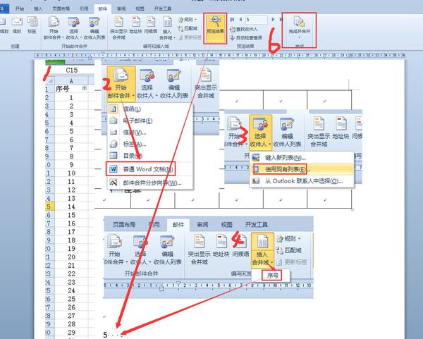 6.点击预览效果可查看序号情况,最后点击完成并合并下拉中选择打印文档,打印所有即可。