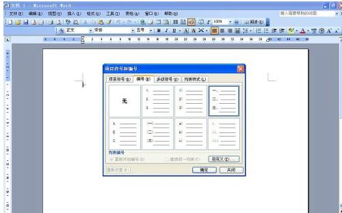 随即出现“项目符号和编号”对话框,切换到“编号”栏,选中“一、二、三。。。。”如图所示
