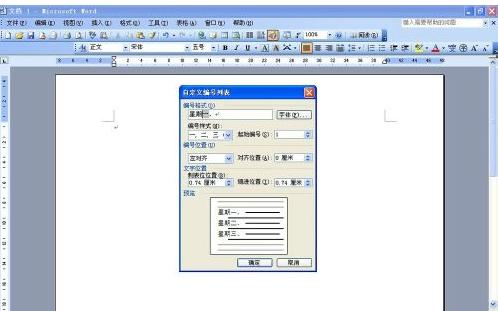 点击右下角的“自定义”,弹出“自定义编号列表”,在“编号格式”的“一”前面添加“星期”,“编号样式”选为“一、二、三。。。”最后点击“确定”如图所示
