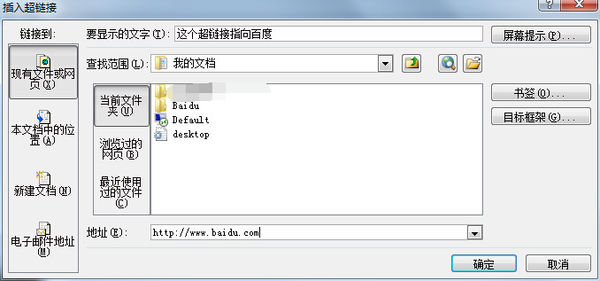 3、弹出对话框,地址后输入链接目标的地址,例如:http://www.baidu.com,点击确定即可。
