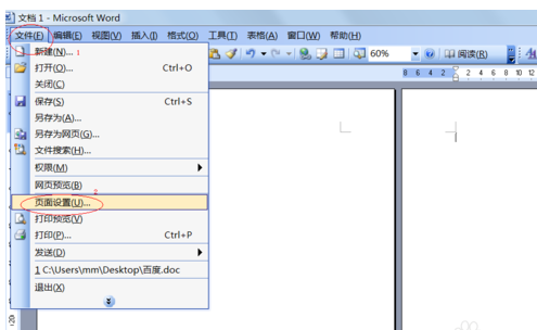 2.此时,打开“文件”菜单(或按Alt+F组合键),选择“页面设置”项(或按U键)(如图2)。