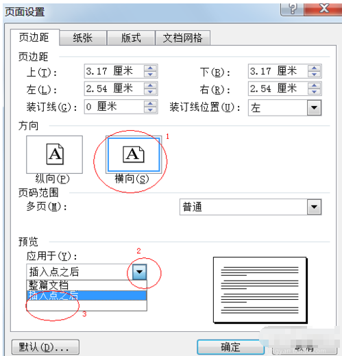 3.在弹出的对话框中,在“方向”上选择“横向”(或按Alt+S组合键),点击“预览”项后面向下箭头(或按Alt+Y组合键),下拉菜单中选择“插入点之后”(如图3),然后点击确定。