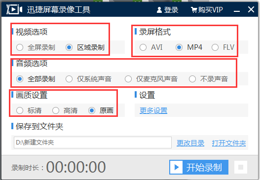 建议使用迅捷屏幕录像工具,功能强大。打开软件我们可以看到在主界面上有一些软件设置参数,第一个是视频选项:其中区域录制下可以自由调节录制窗口的大小;第二个是录制格式,支持AVI和MP4等主流视频格式;第三个是音频选项:音频选项中可以同时录制系统声音和麦克风声音,也可以单独录制某一项声音或者不录制声音;第四个是画质设置:支持标清、高清、原画这三种画质。