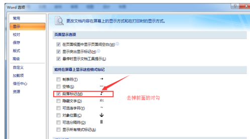 5.点击去掉“段落标记”前面的对勾,然后“确定”。