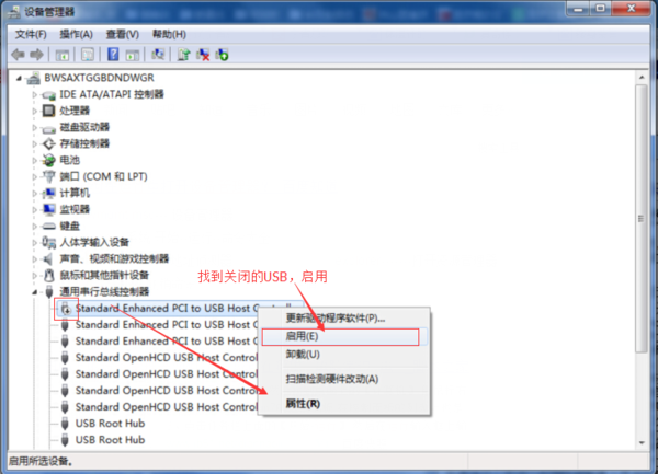 1、开始——运行devmgmt.msc(或者右击我的电脑——属性)—— 设备管理器——通用串行总线控制器---右击启用处于停用状态的USB驱动,启用即可!