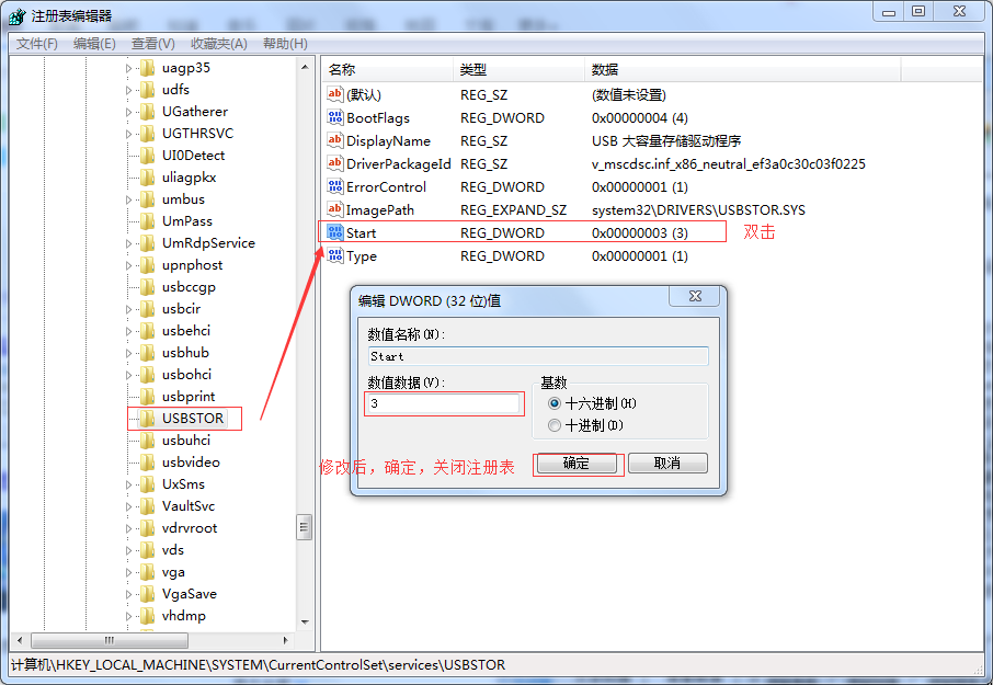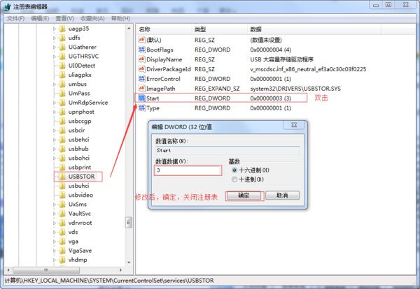 2、 开始--运行里输入regedit 进入注册表--[HKEY-LOCAL-MACHINE/SYSTEM/CurrentContolset/Services/USBSTOR]在双击右边start,4为禁止,3为开启。