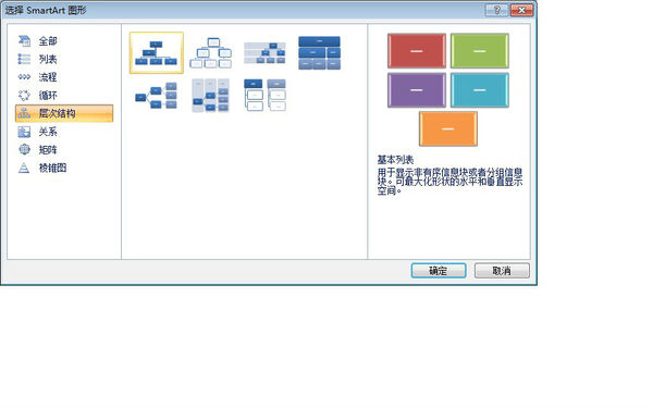 2.在弹出的“选择SmartArt图形”对话框中,选择“层次结构”选项卡,在中间的层次结构图中选择一种需要的图形,单击“确定”按钮。