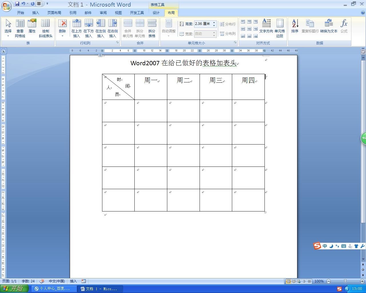 在Word2007中可以在已经做好的表格上方插入一行输入表头。方法: