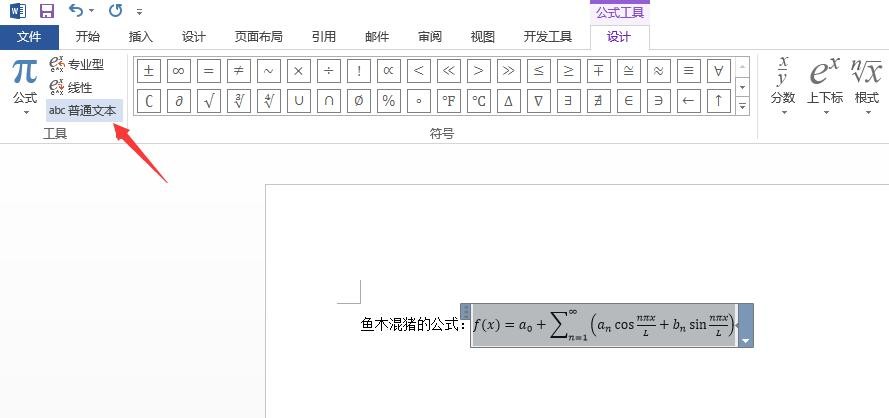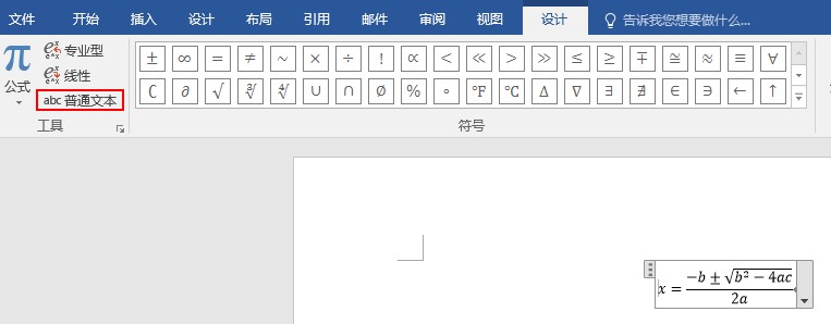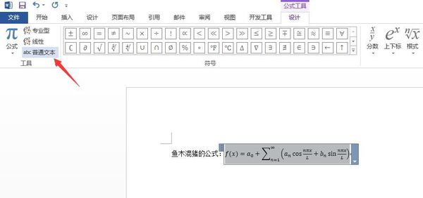2.选择公式后,点击设计选项卡中的“普通文本”: