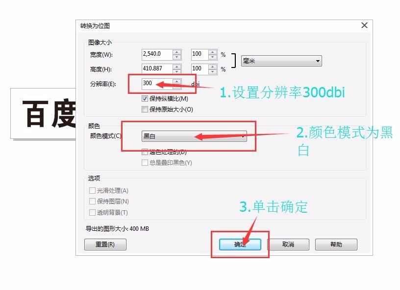 4、在弹出的对话框中将分辨率设置为300dbi,颜色模式设置为黑白,单击确定。