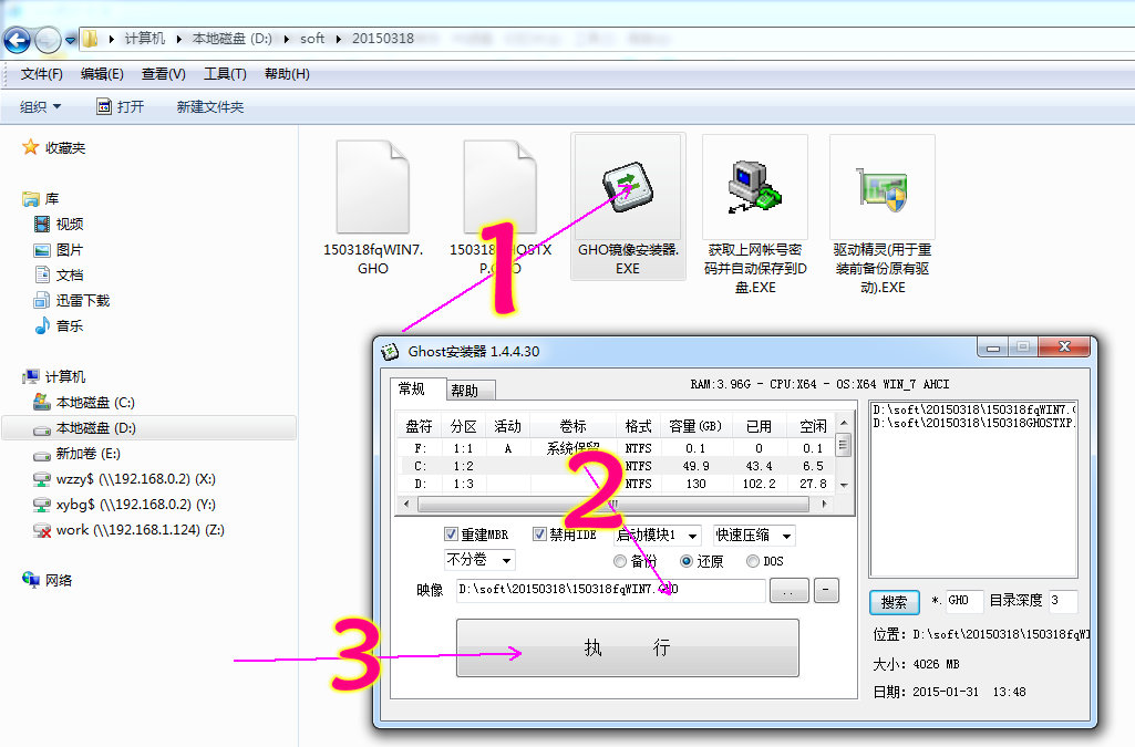 1,先把WINXP、 WIN 7或是WIN 8镜像下载到硬盘里或是预先做个GHO文件保存在U盘里,然后在除C盘以外的盘或者U盘根目录里新建一个GHO文件夹,也可以在D盘根目录下建一个GHO文件夹,然后把WIN7镜像用UltarISO或者WinRAR解压释放到GHO文件夹中。