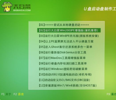 使用启动U盘恢复操作系统,以“大白菜”软件制作的启动U盘为例,可按下面的步骤进行: