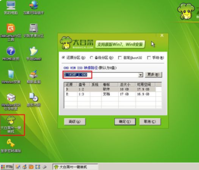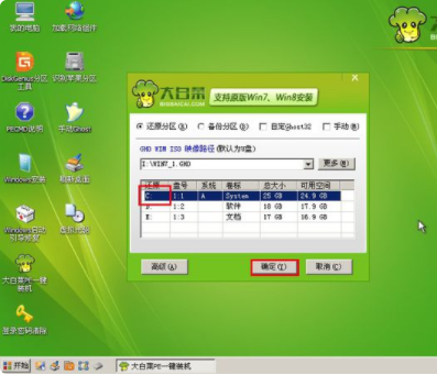 5、选择进行电脑一键还原系统所需的硬盘分区,选择后点击“确定”
