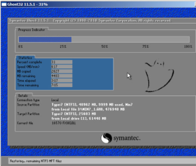 8,这时系统会将GHO中的系统文件复制到C盘指定的地方,复制几个G的文件会需要一定时间,请耐心等一等。