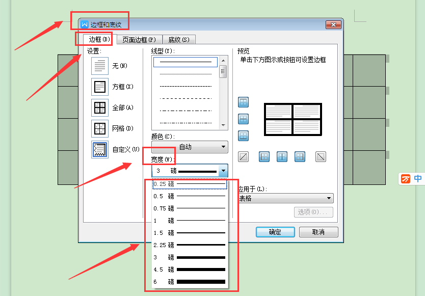 2、在弹出的对话框中,宽度的下拉列表中选择你想要的粗细程度,即可