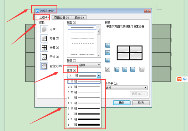 2、在“宽度”中选择一个所需合适的粗线,点击确定按钮即可。