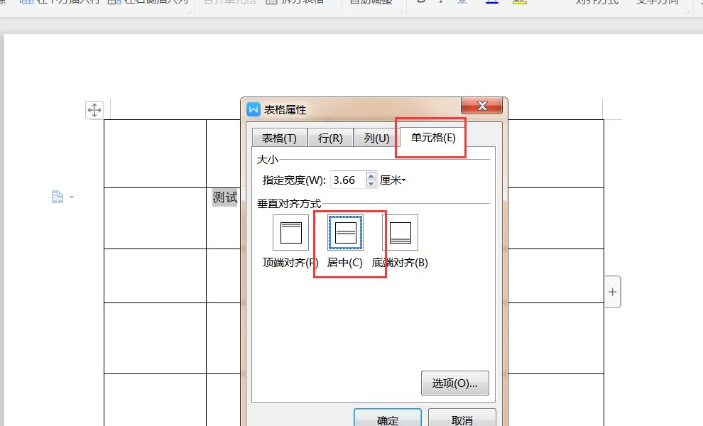3、在打开的表格属性页面中,点击顶部“单元格”选项卡,点击垂直对齐方式为“居中”,并保存;