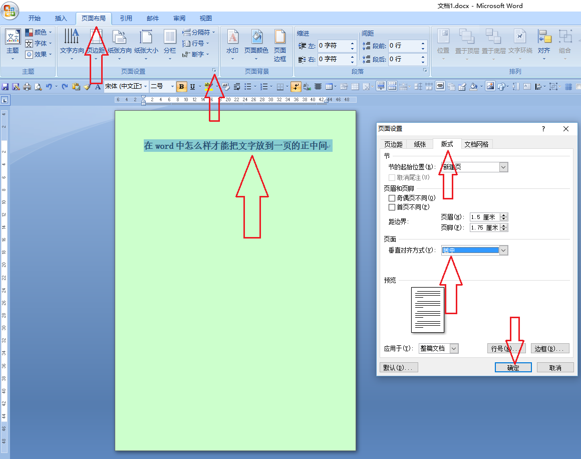 1、打开word文档,选中文字,单击“页面布局”菜单,单击“页面设置”组右侧的扩展按钮,在弹出的“页码设置”对话框中单击“版式”选项卡,在“垂直对齐方式”中选择“居中”,单击“确定”。如下图: