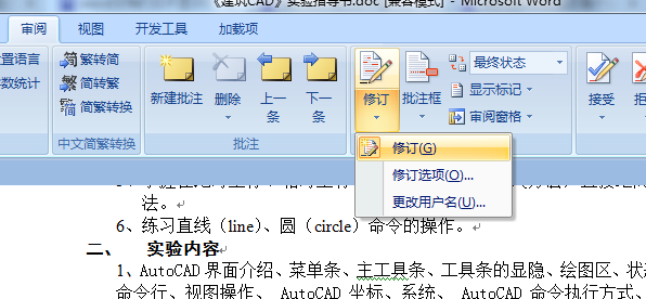4、如果要再显示批注只要点击“审阅”选项卡,单击“修订”组别里的“修订”下拉三角,选择“修订”就可以了