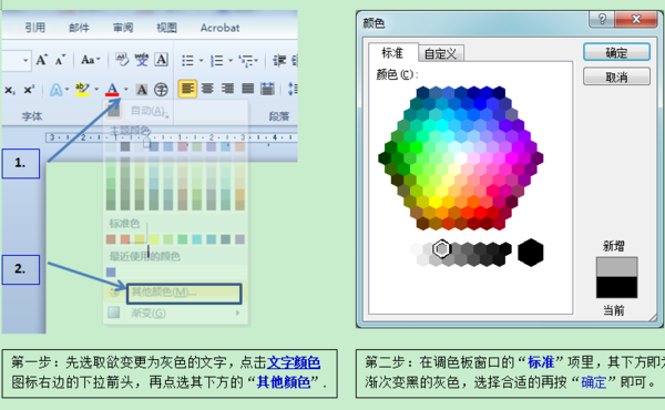 第一步:先选取欲变更为灰色的文字,点击“文字颜色”图标右边的下拉箭头,再点选其下方的“其他颜色”.