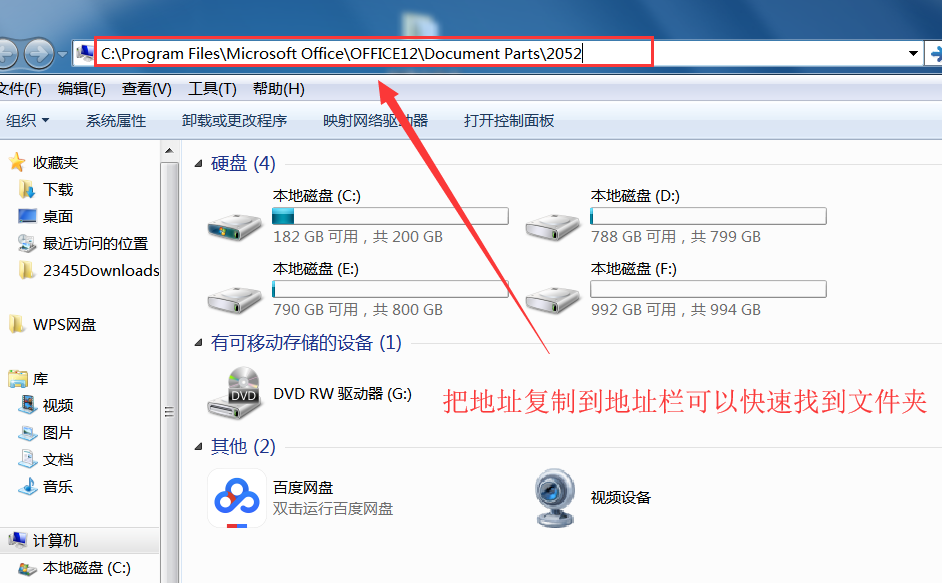 4、双击打开计算机找到【C:\Program Files\Microsoft Office\OFFICE12\Document Parts\2052】文件夹,然后右键单击选择【粘贴】