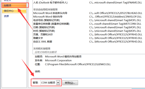 1、打开Word 2007,点击左上角的【office图标】-【Word选项】-【加载项】,转到com加载项,把带钩的都去掉。确定之后再次进入到加载项,转到“Word加载项”,去除列表中所有的项,关闭Word。
