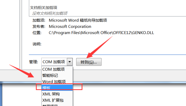 7、点击【管理】后面的下拉箭头,选择【模板】然后单击【转到】