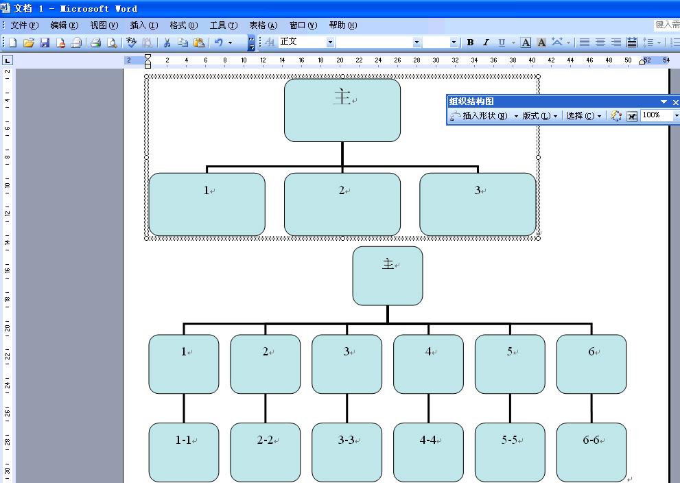 1、插入---图片---组织结构图,会出现基本结构图(上面那个,只有3个分支),点“主”那个框,再点旁边工具栏上的“插入形状”,点3下,就加3个分支,
