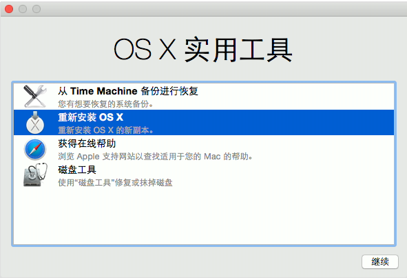 点按“继续”,并按照屏幕上的说明重新安装 OS X。