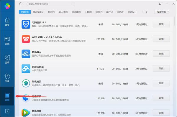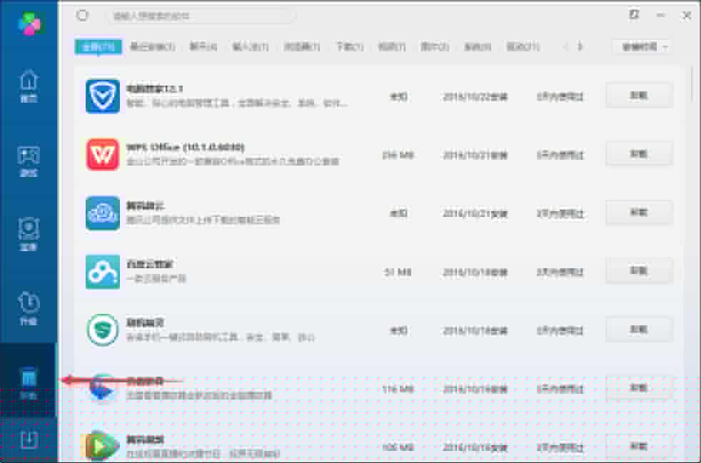 电脑管家将检测当前电脑上已安装的全部软件,您可以选择卸载不想要继续使用的软件,卸载不常用的软件有助于提升系统性能,增加磁盘可用空间。