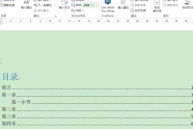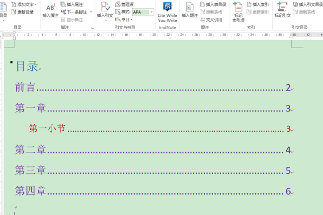 步骤一:将各个章节分别另起一页并改变标题之后,目录并未改变,此时,点击“引用”菜单中的“更新目录”