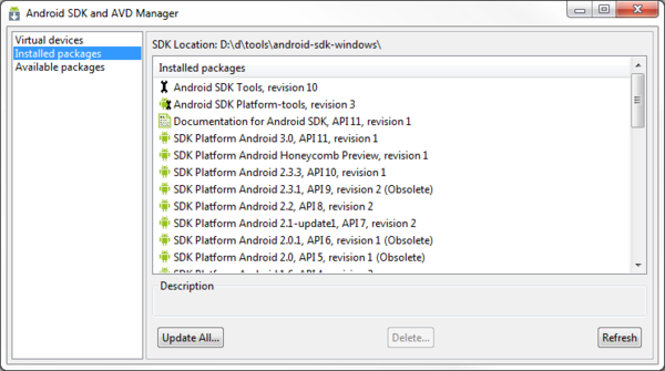 该工具包含很多重要的功能,包括管理不同的 Android SDK 版本(构建目标), Android 的版本众多,API上有些兼容性问题。另外该工具还用于管理 Android 虚拟设备配置 (AVD) ,用来配置模拟器