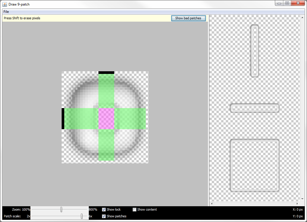 这个九宫格绘画工具(draw9patch.bat)可以很容易的通过一个所见即所得(WYS|WYG)的编辑器来创建一个九宫格NinePatch图
